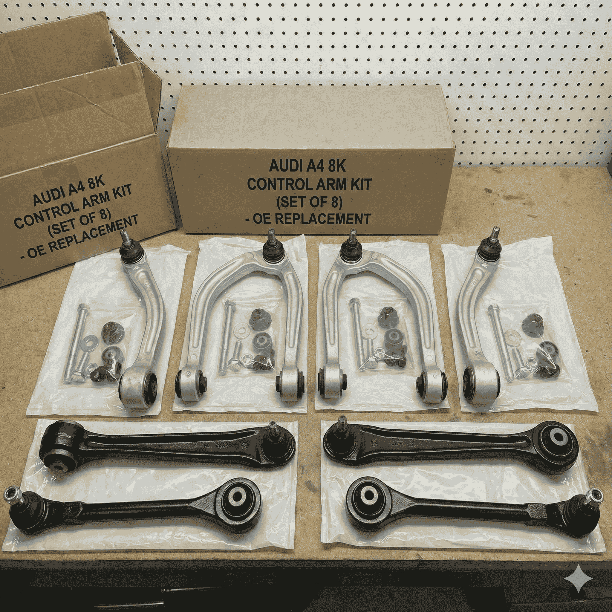 Complete lower and upper control arms kit for Audi A4 8K. Restores suspension stability and steering precision.